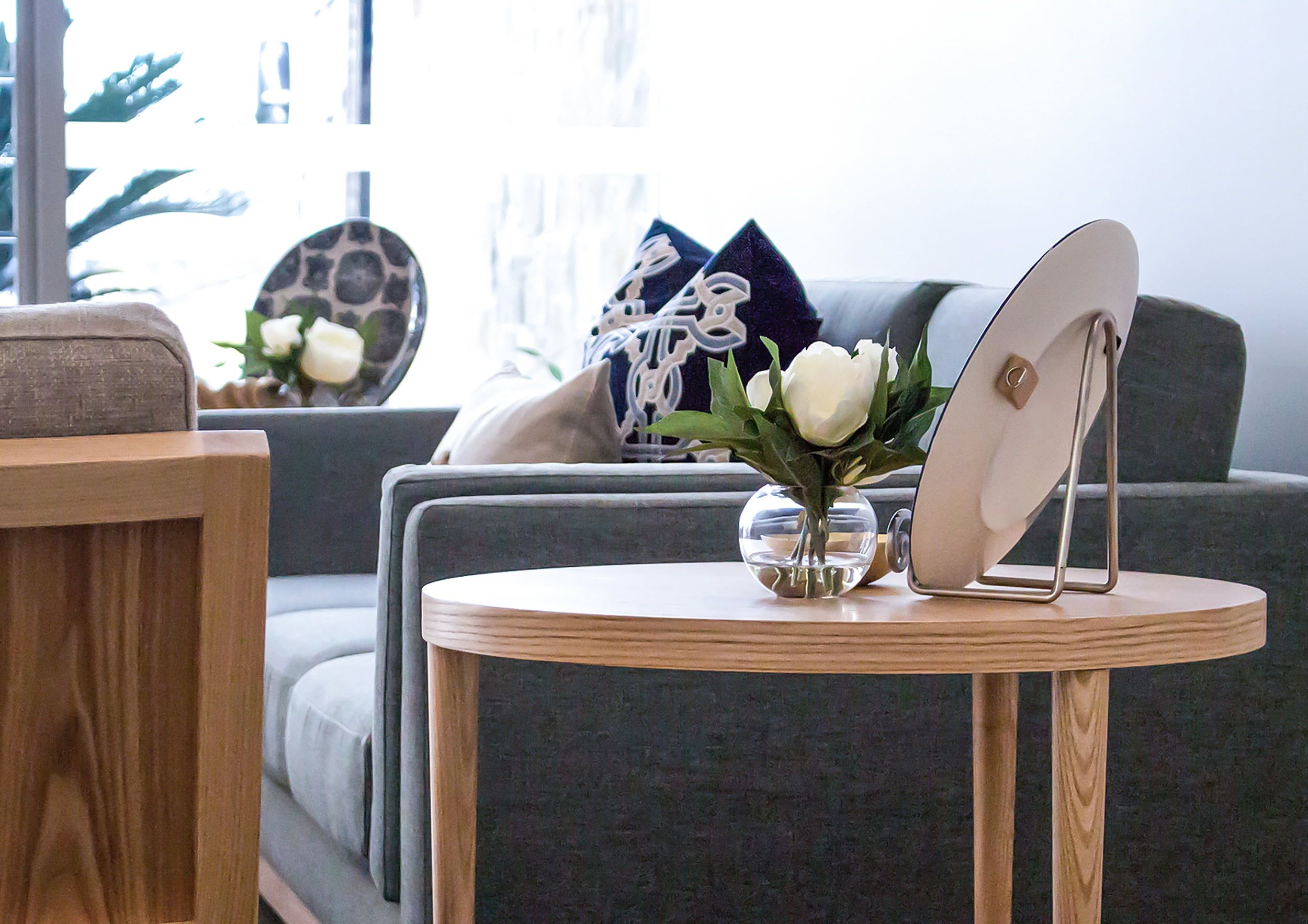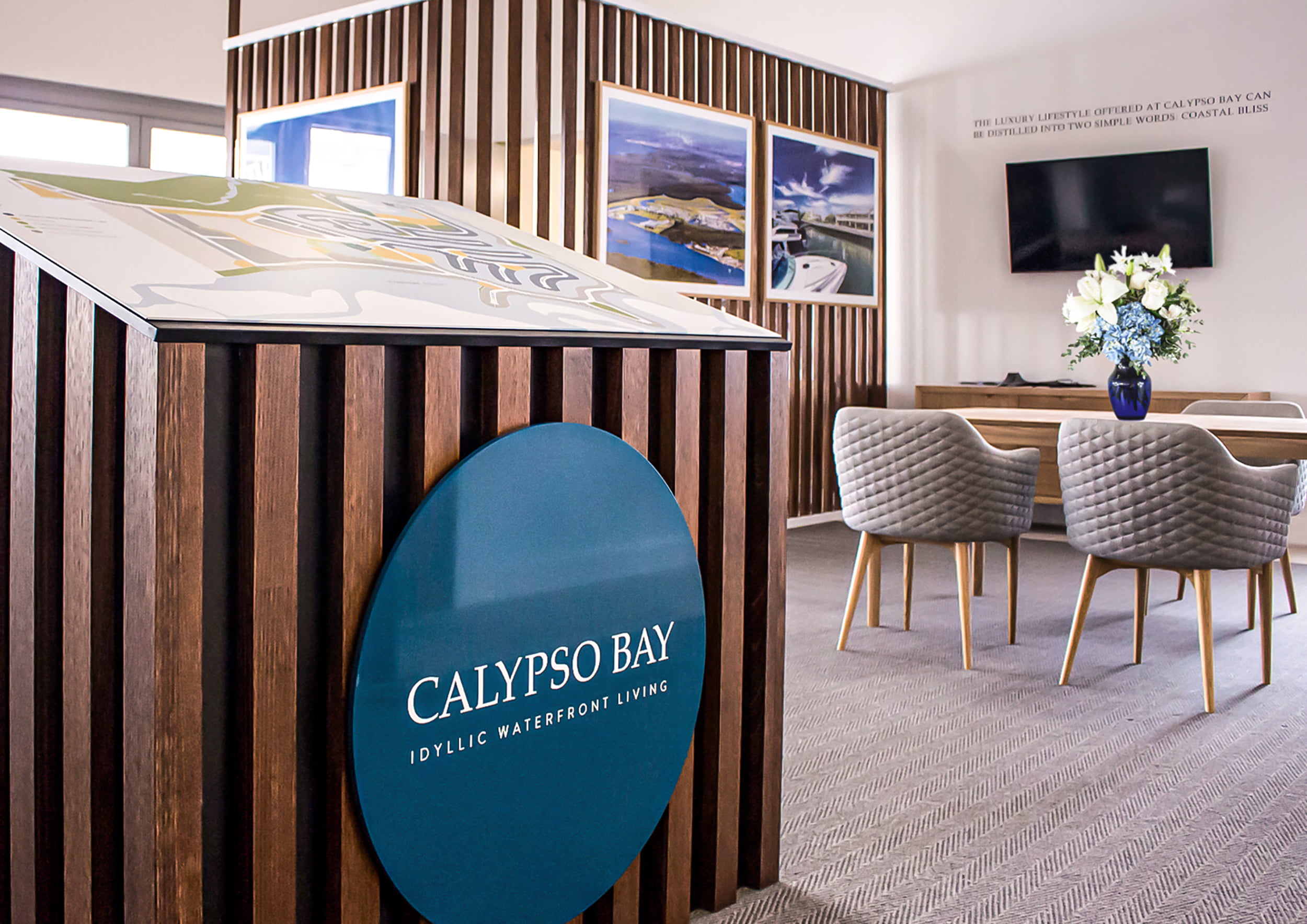 From furniture selection down to a small vase of flowers, effective branding entails close consideration of how colours, tones and texture can reinforce the feeling of a development's brand. With natural timber framing inspired by the jetties and marinas surrounding the development, this is a sales suite that captures the essence of idyllic waterfront living: the feeling of a life lived at Calypso Bay.